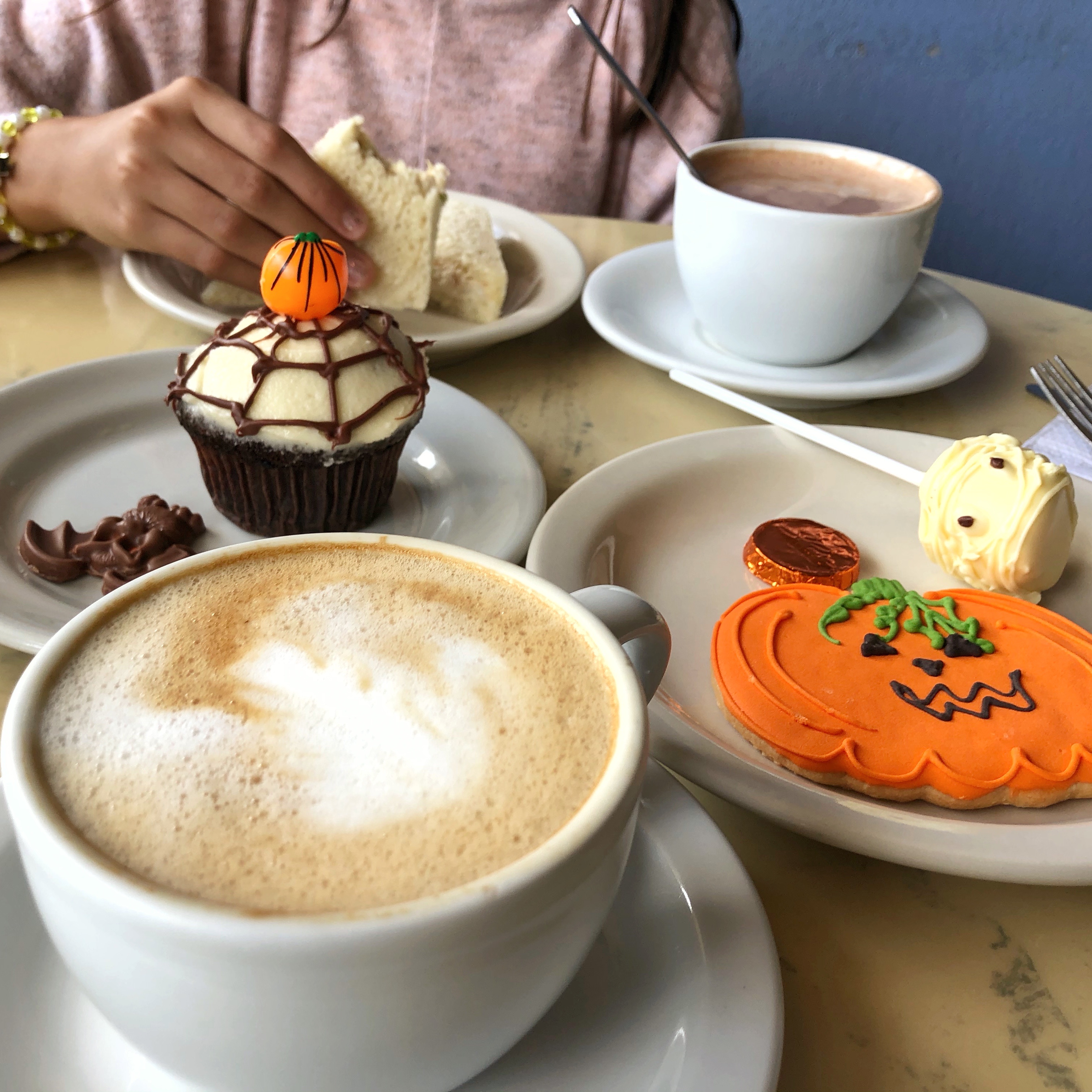 🌧 Tardes de lluvia son tardes para consentirse! Cappuccino y Cocoa caliente (café y cacao salvadoreño) ☕️🌿, sándwich de pollo🥪, cupcake de chocolate🧁🍫, galleta calabaza de vainilla🍪, BOOMallows (marshmallows bañados en chocolate 🍡🍫), y murciélago de chocolate! 👻🦇
