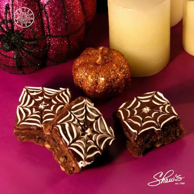 Tenebroso brownie con chunks de chocolate oscuro y walnuts, decorado con telarañas.️