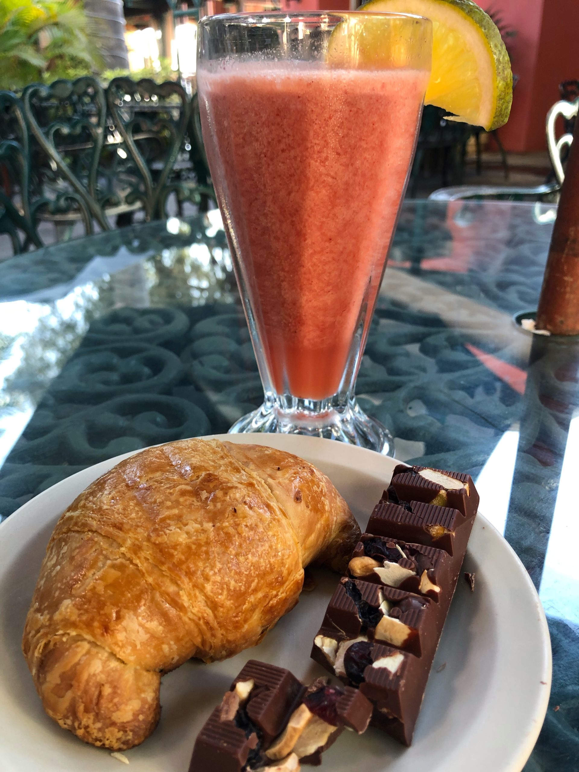 😌 Comencemos bien el día con smoothie de naranja y fresas naturales, croissant de queso y jamón, y una Fruit ‘n nut bar de chocolate oscuro… 💗