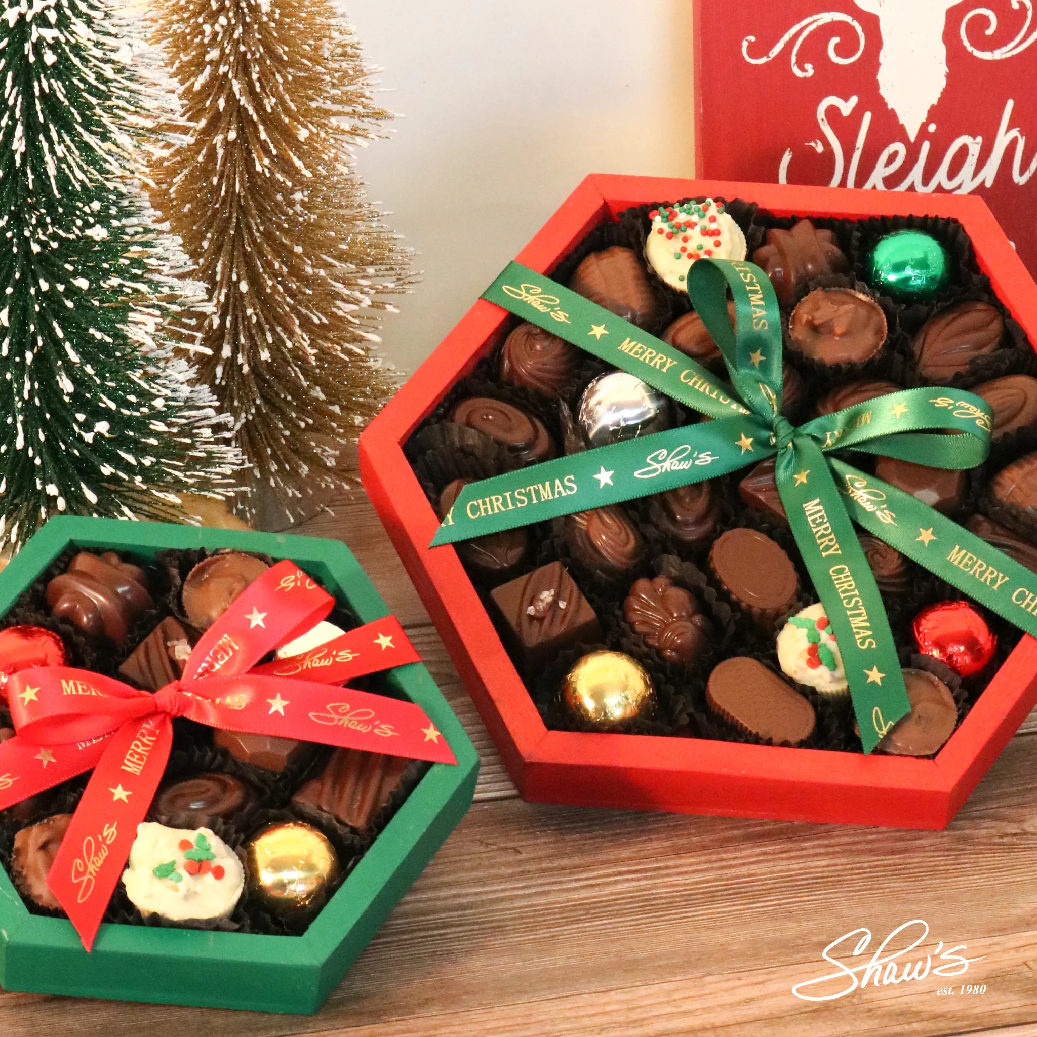 Lleva la magia de la Navidad a tu hogar con nuestros elegantes hexágonos de madera, llenos de bombones y truffles de chocolate en tonos festivos. Un regalo que encanta a la vista y al paladar. ¡Haz que esta temporada sea inolvidable para compartir!